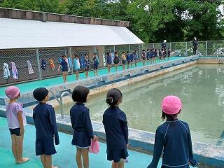 今日は、1年生のプール開きでした。本校は、小プールがないので、週の後半は水量を減らして低学年の子ども達が水泳学習を行います。待ちに待ったプールで、子ども達は大喜びでした。コロナ禍で不必要なおしゃべりは厳禁の約束をしっかり守りながら、友だちとの距離を取りながら、水に入っていきました。水中でジャンプしたり、顔浸けたり、初めてのプールを楽しんでいました。
