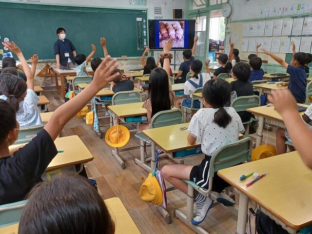 今日は、3年生の学級活動の時間に『いのちの教育(性に関する教育)』の授業がありました。「いのちのつながり」をテーマに、自分の成長過程を振り返り、支えてくれた多くの人たちに感謝の気持ちをもち、自分のいのちの大切さに気付かせることがねらいの授業でした。子ども達は、いろんな動物の赤ちゃんの写真から、生まれてくる形や成長の仕方は様々なことに気付いたり、自分たちが成長してきた過程を話し合ったり、積極的に学習を進めていました。そして、周りの人から助けてもらったり、支えてもらったりしたことをみんなで発表し合いながら、考えを深めていきました。最後に、絵本「おかげさま~いのちのまつり」の読み聞かせを聞いて、将来、お父さんやお母さんになったら自分の子どもを大切に育てたいとつぶやいているのが印象的でした。