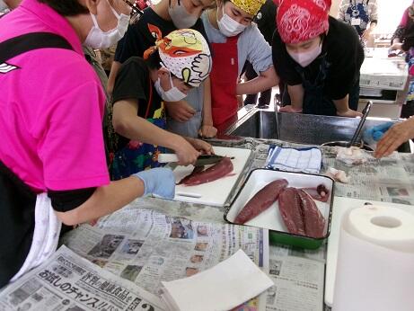 新鮮なカツオが一尾まるごと各グループに配られ、食べやすくするためにカツオをさばいていきます。