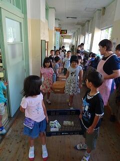高学年に手伝ってもらいながら、食器を持って、給食コンテナ室に向かいました。
