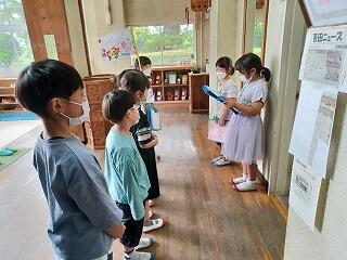 今日は、1・2年生の参観日でした。1年生の保護者の皆さんにとっては、初めてお子さんの授業の様子をご覧いただける機会でした。いかがだったでしょうか。4月から2ヶ月の間に、できるようになったことがたくさんできた子ども達です。国語の授業でしたが、リズムに合わせて小さい「つ」のつく言葉を元気よく読んでいました。2年生は、あるものをペアで、一人が言葉で説明し、もう一人がタブレットで絵に表す学習でした。とても楽しそうでした。どちらの学年も、お家の人が見ているといつも以上に真剣に学習に望む姿が印象的でした。