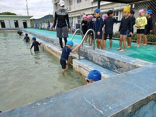 今日は、1年生のプール開きでした。本校は、小プールがないので、週の後半は水量を減らして低学年の子ども達が水泳学習を行います。待ちに待ったプールで、子ども達は大喜びでした。コロナ禍で不必要なおしゃべりは厳禁の約束をしっかり守りながら、友だちとの距離を取りながら、水に入っていきました。水中でジャンプしたり、顔浸けたり、初めてのプールを楽しんでいました。