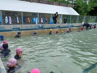 今日から水泳学習が始まりました。1・2校時、小雨が降る中、5年生が初泳ぎをしました。若干肌寒い天候でしたが、子ども達は大喜びでした。1年ぶりの水泳ですので、十分に水慣れの運動を行っていました。水泳学習もコロナ禍でいろんな制約がありますが、子ども達の泳力を伸ばせるように指導していきます。この後計画されていた3・4年生は、雨のために延期しました。次の体育の日をお楽しみに。