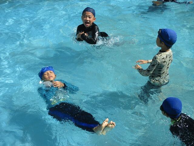 そこで洋服を着たままプールに入る着衣泳指導を行いました。子ども達は水に濡れた服の重さや水中での動きにくさに驚いていました。また、ペットボトルを使った対処法や、流れに逆らわずにできるだけ体力を温存することなどを学びました。