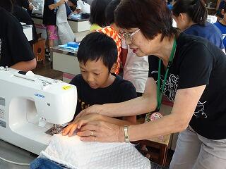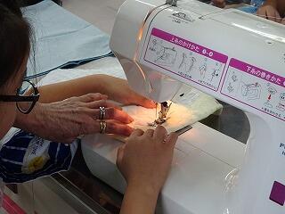 まち針で仮止めし、ボランティアさんのアドバイスに従い、慎重に縫い合わせていました。