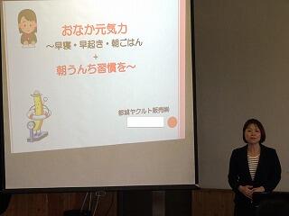 まず、講師による「おなか元気力」をテーマにした、生活のリズムや朝食の大切さ、排便の習慣などとても役立つ講演を聴きました。