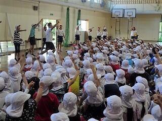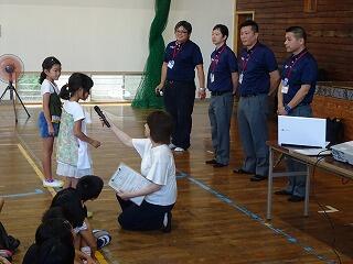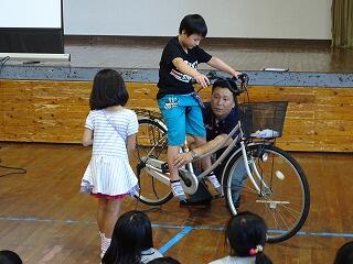 体育館で、自転車事故事例や点検方法、安全な乗り方を学びました。