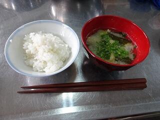 出来上がるとごはんを茶碗に盛り、みそ汁をお椀に入れ、完成。