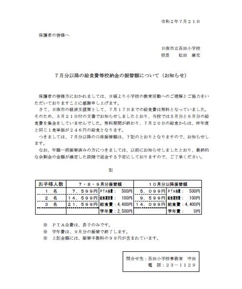 7月分以降の給食費等校納金の振替額について(お知らせ)