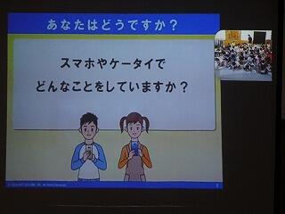 外部講師のNTTドコモ職員に、遠隔操作のリモート講義で、スマホ・ケータイを持つときに気をつけてほしいことについて、お話をしていただきました。