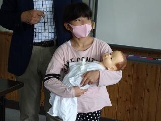 最後に疑似体験として、模型の赤ちゃんの抱っこと妊婦さんの疑似体験を行いました。