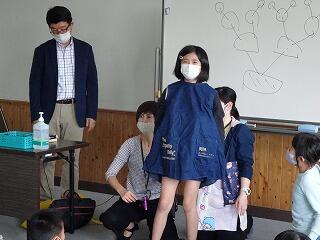 体験してもらった子どもたちは、「重い」「首がグラグラする」「歩きにくい」「座れない」など、子育てや妊婦さんの大変さを実感していました。