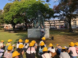 目的は、宮崎県総合文化公園内にある宮崎県の郷土先覚者の銅像をもとに、先覚者の功績について説明を聞くことで、郷土の先覚者に関する興味・関心を高めることが出来る。