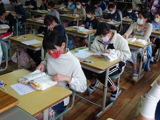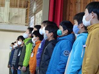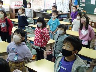 終業式の最後に各クラスで、今年度初めての全校児童による校歌斉唱を行いました。みんなマスクをしたままの歌唱となりましたが、1年生は歌詞を見ながら、一生懸命校歌を歌っていました。