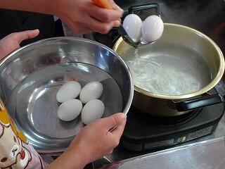 時間が経つとゆでたまごを冷水に入れ一旦冷やし、冷えたゆでたまごの殻をむきました。