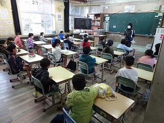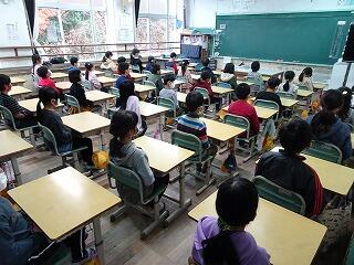 校内放送時は、各クラスの子どもたちは、立腰の姿勢で聞いていました。