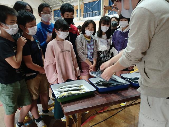 今日は、食育ティーチャーの矢野さん、四月一日さんと県農林振興局の三木涼平さんをお招きして、6年生を対象に日南近海で採れる魚についてのお話をしていただきました。人気ユーチューバーでもある三木さんの興味深い話に子ども達は引き込まれていました。また、矢野さんが今朝、目井津港で水揚げされた数種類の魚を持ってきてくださったので、子ども達は実際に手に取り、黒潮の流れにのってたくさんの種類の魚が水揚げされることを実感していました。