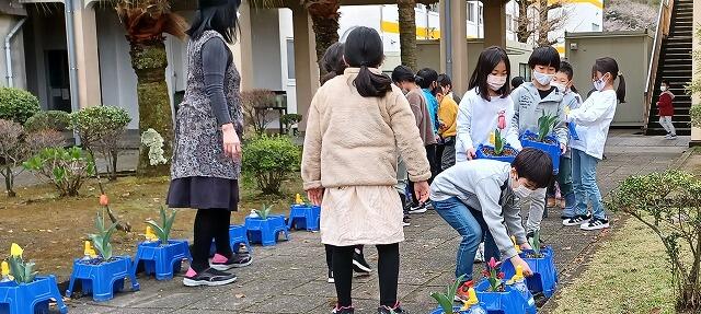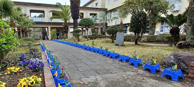 卒業式に向けて、1年生が一人一鉢で育てているチューリップを正門から児童玄関までの通路に並べてくれました。ピンクや黄色のかわいい花が咲きそうなものもありました。卒業式の日には、たくさんの花が開いているでしょう。