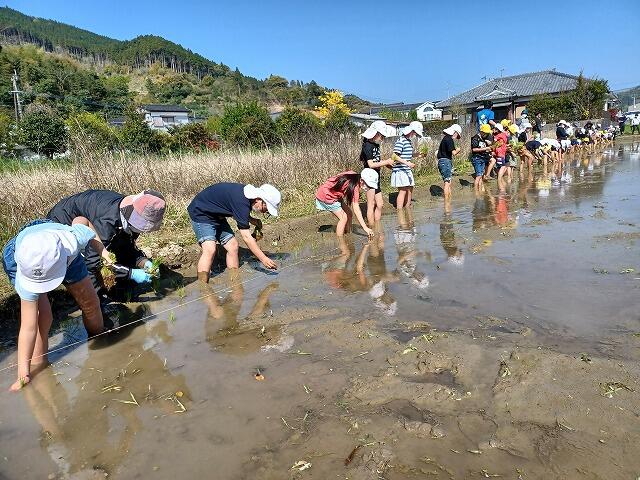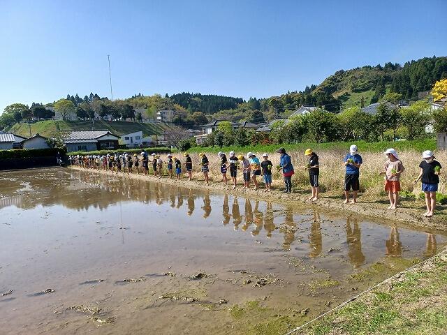 青空の下、JAはまゆう女性部・青年部、地域の自治公民館長さんを講師に招き、5年生が田植えを行いました。昔ながらの方法で、田植え綱を張り、赤い印のあるところを目印に苗を4,5本ずつ植えていきました。新型コロナの影響のため、クラスごとに分散して行いました。田んぼの泥の感触に思わず声を出してしまう子ども達でしたが、秋の豊作を祈りながら、丁寧に植えていきました。今年もおいしいお餅が食べられますように・・・。