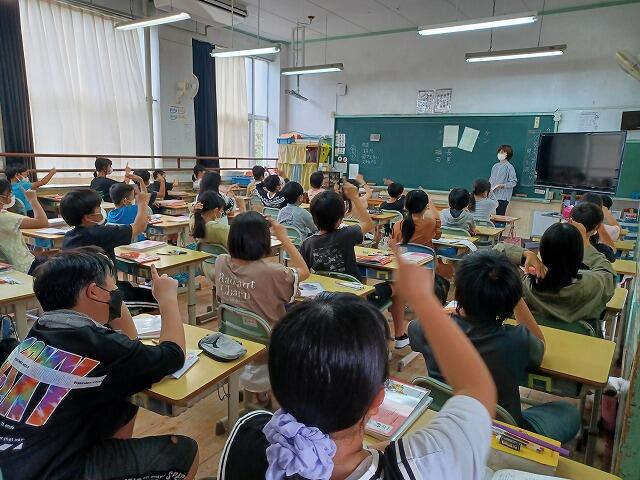今日は、ALTの来校日でした。外国語加配教員と担任の3人で楽しく英語の学習を行いました。3年生は、いろんな国のあいさつについて学習していました。アメリカ、韓国、インド、ケニアなどの国旗やあいさつをつかった学習していました。4年生は、カードに自分の出身国と好きな物を書いて、お互いに言い合う学習をしていました。1対1の対話を楽しんでいました。どちらも英語をつかったコミュニケーションの楽しさを味わえる学習でした。