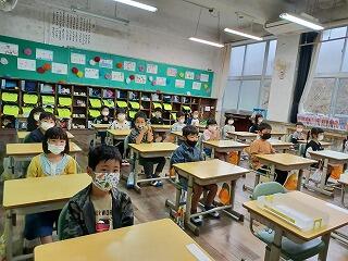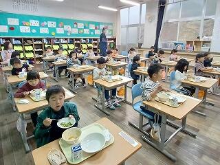 昨日から1年生の給食がスタートしました。2日目は、子ども達の大好きなカレーでした。4時間目が終わると手洗いうがいを済ませて、給食当番が来るのを静かに待つことが出来ていました。お兄さんお姉さんが手際よく配膳をしてくれていました。その後、どのクラスも食器を持って、上手に、おいしそうに食べていました。ちゃんと黙食もできていることに感心しました。感染防止対策はばっちりでした。もりもり食べて大きくなって欲しいと思います。