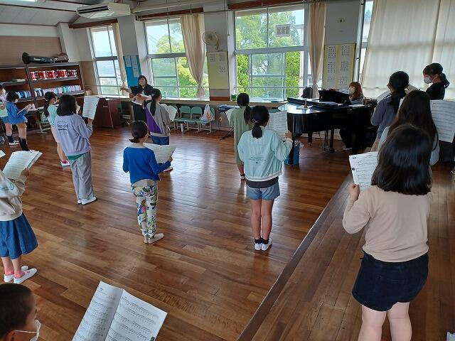 音楽室からきれいな歌声が聞こえてきました。現在、家庭訪問期間中で、放課後に合唱部が練習していました。マスクを着用し、距離を保ち、音楽室の窓を全て開けて換気をしながら、練習をしています。6年生が卒業して、新しいメンバーでの練習もコロナ禍で思うように進みませんが、素人の私には、本当に素晴らしい歌声だと感動します。