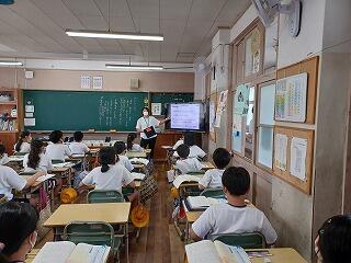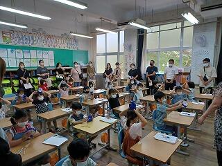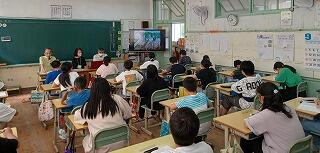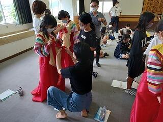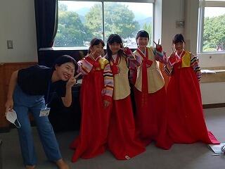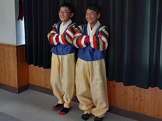 今日は、県の国際交流員であるヤン・ヘジョンさんをお招きして、第2回国際理解講座を実施しました。前回、韓国の食や住居、通貨など様々な韓国の文化について学習しました。今回は、韓国の民族衣装である「ハンボク」について教えてもらいました。子ども達は、「ハンボク」のカラフルな色や様々な模様には、いろんな意味があることを初めて知りました。それから、実際にその衣装に袖を通してみました。ズボンのようになっている「バジチョゴリ」。スカートのようになっている「チマチョゴリ」。チマチョゴリの方は、リボンの結び方など着方が難しいので、ヤン・ヘジョンさんに手伝ってもらいました。みんな初めて着るチマチョゴリやバジチョゴリを着て、満足げにポーズを取っていました。とても似合っていました。