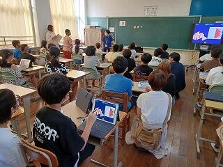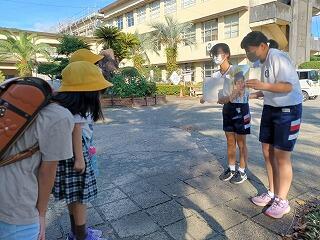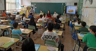 今日は、6年生の総合的な学習の時間に、県南地区で活動されている退職教職員協議会の中武さん、福田さん、隈本さんを講師に招き、平和についてお話をしていただきました。今なお戦闘が続いているウクライナのことから、戦争は遠い昔、遠いところで起こっていることではなく、身近な日南でも悲惨な戦争が起こっていたことを教えていっただきました。昭和20年、戦争真っ只中の日本、そして、日南でも多くの方が命を落とされたこと、南郷では人間魚雷の訓練が行われていたこと等を教えてくださいました。子ども達は、日々の食べものも無い、厳しい生活を送った経験を聴いて、改めて今の平和のありがたさを実感しているようでした。11月には、修学旅行で知覧を訪れます。それまでに、さらに、平和や命の大切さについて学習を重ねていきます。