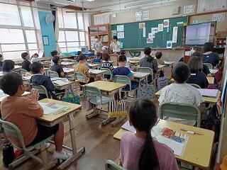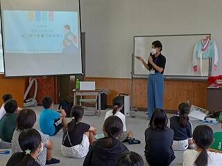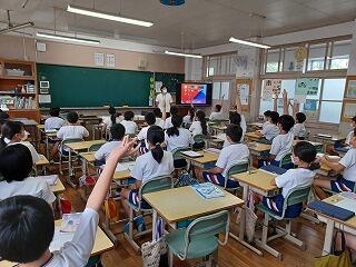 今日は、4年生の総合的な学習の時間に日南市役所市民生活部美化推進課の職員2名を講師にお招きして、ゴミの減量リサイクルについての学習をしました。日南市のゴミ収集の仕方や4R:リフューズ(Refuse)・リデュース(Reduce)・リユース (Reuse)・リサイクル(Recycle)について学びました。既に社会科で学習していたこともありましたが、子ども達は真剣に話を聞いていました。これまでの大量消費社会から資源循環型社会へ、一人一人ができることを取り組んでいくことが大切だということを教えていただきました。ゴミの減量についてご家庭でも話し合ってみてください。最後にエコバックをプレゼントしていただきました。貴重なお話からお土産まで、ありがとうございました。