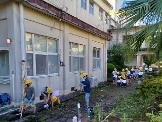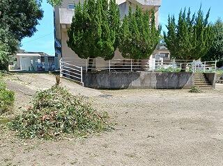3連休は、台風14号の接近で宮崎県内は大きな被害がでました。本校でも、南校舎1・2階の雨漏りや大きな樹木の倒木がありました。幸い人的な被害がなかったことに、ほっと胸をなで下ろしました。今日の1校時は、みんなで台風の後片付けをしました。1・3年生は、雨漏りで教室移動があったので、それ以外の学年で、さくら坂、きつね坂、ねこ坂、運動場、玄関周辺、体育館周りを分担して行いました。台風で吹き飛ばされたたくさんの枝葉を集めました。みんなが力を合わせて取り組んだから、あっという間に美しい学校になりました。ご苦労様でした。1・3年生は、もうしばらく教室が使えませんが、特別教室でお勉強をがんばってください。
