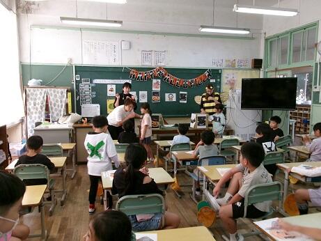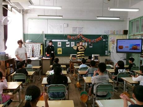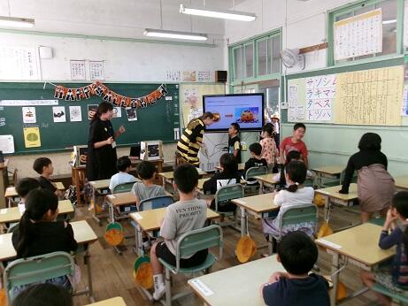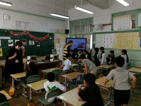 学級担任と外国語専科、ALTのアビゲイル先生が、チームとなって「ハロウィンについて知ろう」の学習でした。