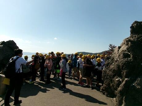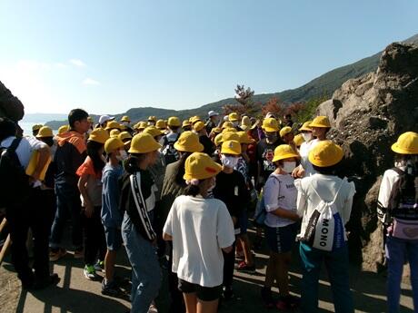 桜島では記念写真を撮った後、バス中でゲームや「茶碗蒸しの歌」などで盛り上がり、帰路につきました。