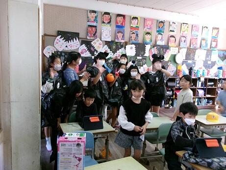 10月31日(火)の昼休みには、5年生が学校を盛り上げようと、仮装して低学年教室を回りました。