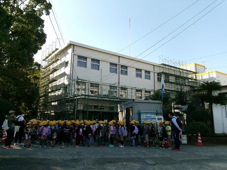 管理棟の外装工事がほぼ終わり、真っ白な壁の様子が1年生が出かける時の背景として写っています。