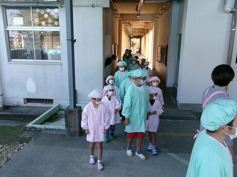 今週から1年生が5・6年生に付き添われて、給食当番の仕事に参加しています。