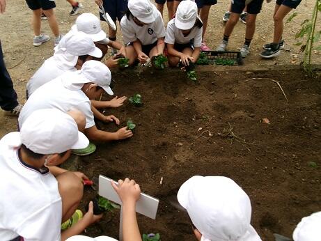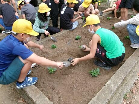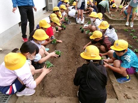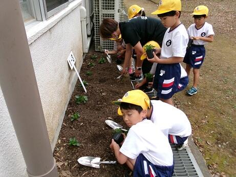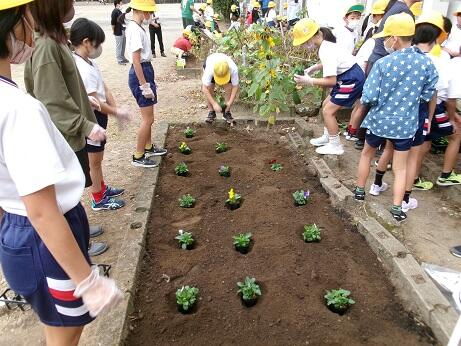 パンジーとビオラの苗を植えました。苗の配置を考えたり、苗の持ち方を学んだりしていました。