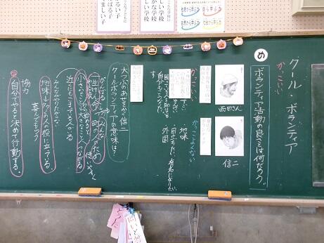5年の読み物資料「クール・ボランティア」をもとに、「ボランティア活動のよさ」について話し合いました。