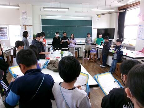 最初に、お別れ遠足のウォークラリーの班ごとに集合しました。次に、5年生がウォークラリーの出し物について説明しました。最後に、各班ごとに自己紹介をして、ウォークラリーのめあてを決めました。