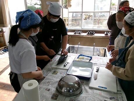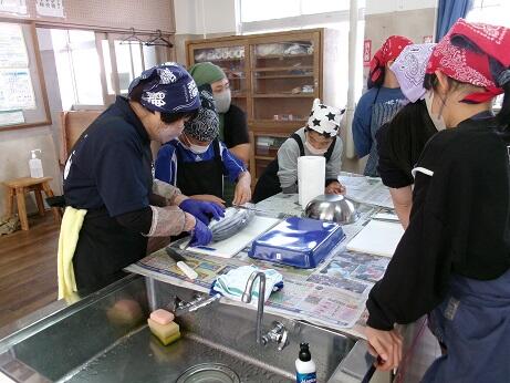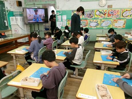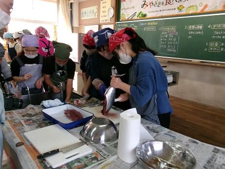 2月20日(火)には、日南市役所水産課や日南漁業協同組合、大堂津漁協婦人部、食育ティーチャー、地域ボランティアの皆様方のご協力のもと、5年生がカツオさばき体験を行いました。21日(水)にも、もう一つのクラスが行います。