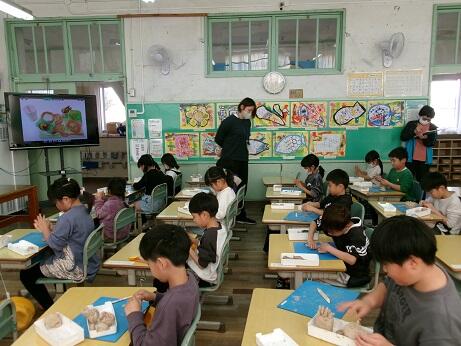 チャイムとともに着席・黙想して、立腰の姿勢も立派な1年生です。粘土の技法を確かめることから始まりました。