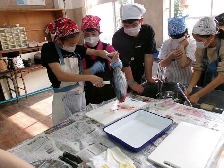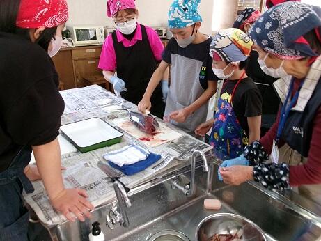 新鮮なカツオが一尾まるごと各グループに配られ、食べやすくするためにカツオをさばいていきます。