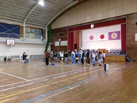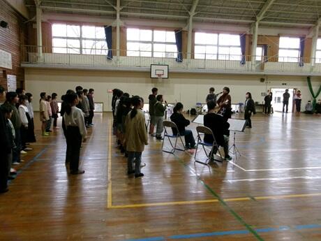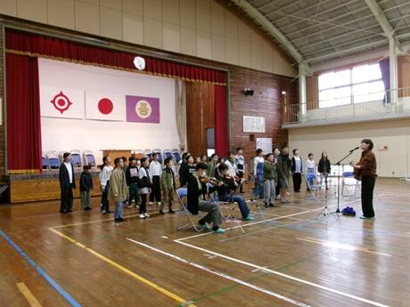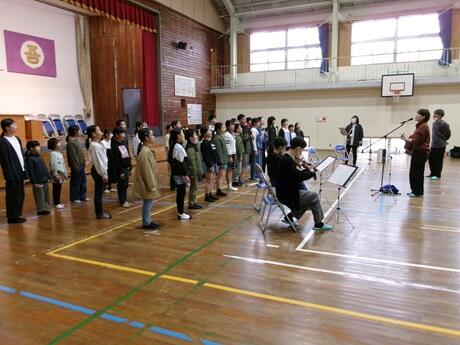 約2時間の練習の中で、井手綾香さんのきれいな歌声とバイオリンのやさしい音色、吾田小合唱部の透き通ったバックコーラスが見事に調和されていきました。明日の本番が待ち遠しい感じのできばえでした。