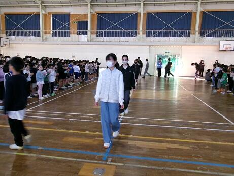 始めに、1~4年生からの感謝の言葉とお別れの歌の発表がありました。次に、卒業生から卒業式で歌う歌の発表が行われました。最後に、卒業生が1~4年生の間を通って、拍手で見送りました。