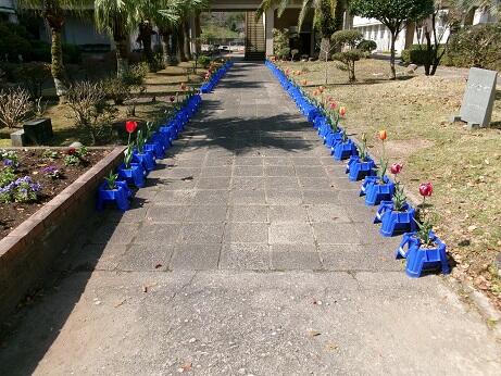 さらに、3月22日(金)には、1年生が育てた一人一鉢のチューリップが校門から靴箱へと続く道に並べられていました。