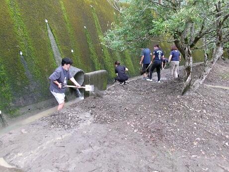 テントの向こう側では、本校の教職員たちが少しでも水はけがよくなるように、溝掃除をしてくれていました。
