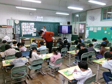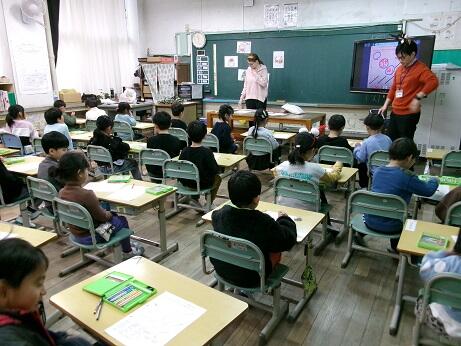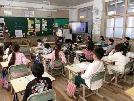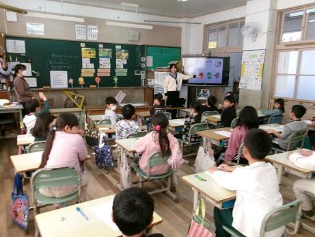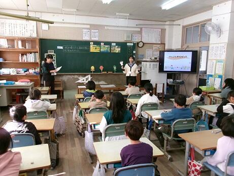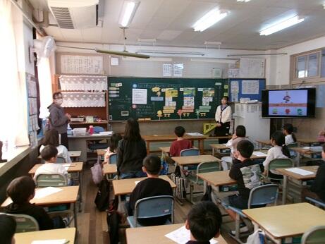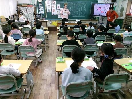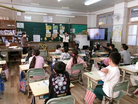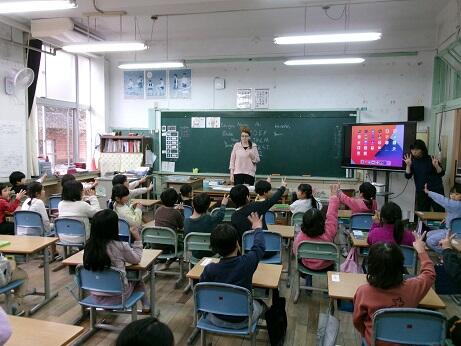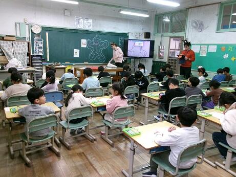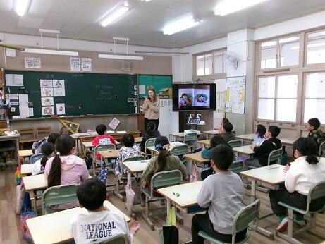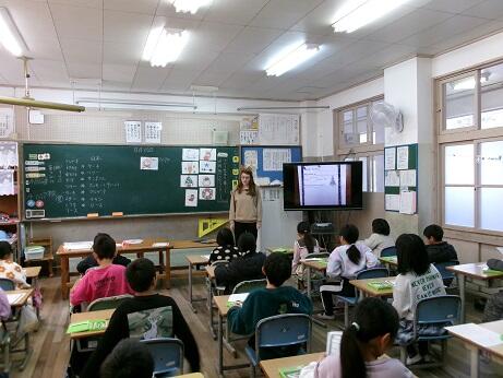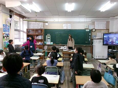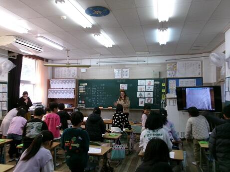 12月18日(水)には、1年生を2グループに分けて、ALTの先生と一緒に外国語に慣れる学習を行いました。