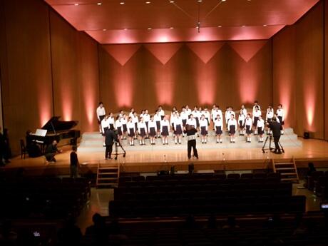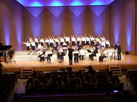 最初は、日南市民吹奏楽団とのコラボレーションでした。次に、合唱曲「たからもの」と「ほらね、」の発表がありました。最後には、合唱曲「未来が生まれている」のダンスを組み入れた発表でした。