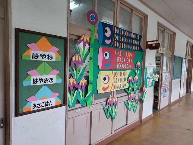 保健室の廊下に、きれいな鯉のぼりとあやめの装飾が掲示してあります。また、兜の早寝・早起き・朝ご飯を呼びかける装飾にも目を引きます。養護教諭から子ども達へ季節感あふれるメッセージです。新年度が始まり1ヶ月。疲れも出てくる頃です。コロナもまだまだ収束しそうにない状況です。心も体も健康第一でがんばっていきましょう。さて、運動場では、6年生がハードルの授業をしていました。今年度から体育専科が配置されました。4年生以上の学級は専門の教師が体育を受け持ちます。目指す子ども像でもある「たくましい子」になれるよう、体力づくりも頑張っていきます。
