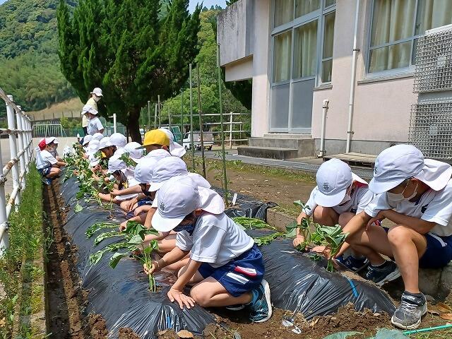 今日は、2年生がサツマイモの苗を植えました。中庭の畑にマルチを張って準備をしてくださった地域の伊豆元さんのご指導の下、1本1本丁寧に植えていきました。秋の収穫が楽しみです。伊豆元さん、いつもありがとうございます。