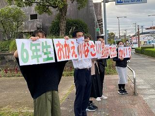 中央公園では、「6年生 おかえりなさい。いい思い出はできたかい。」のボードでお迎え。